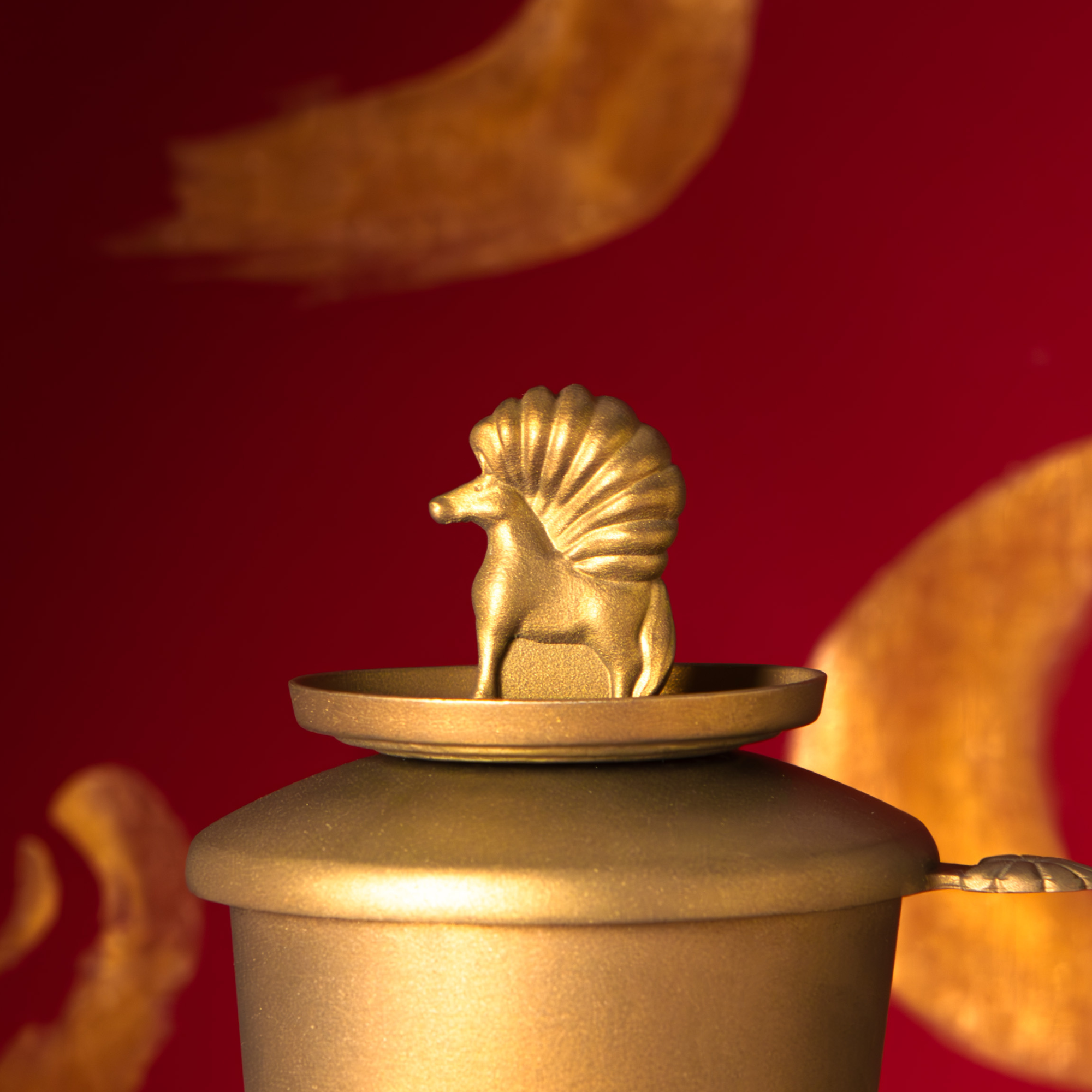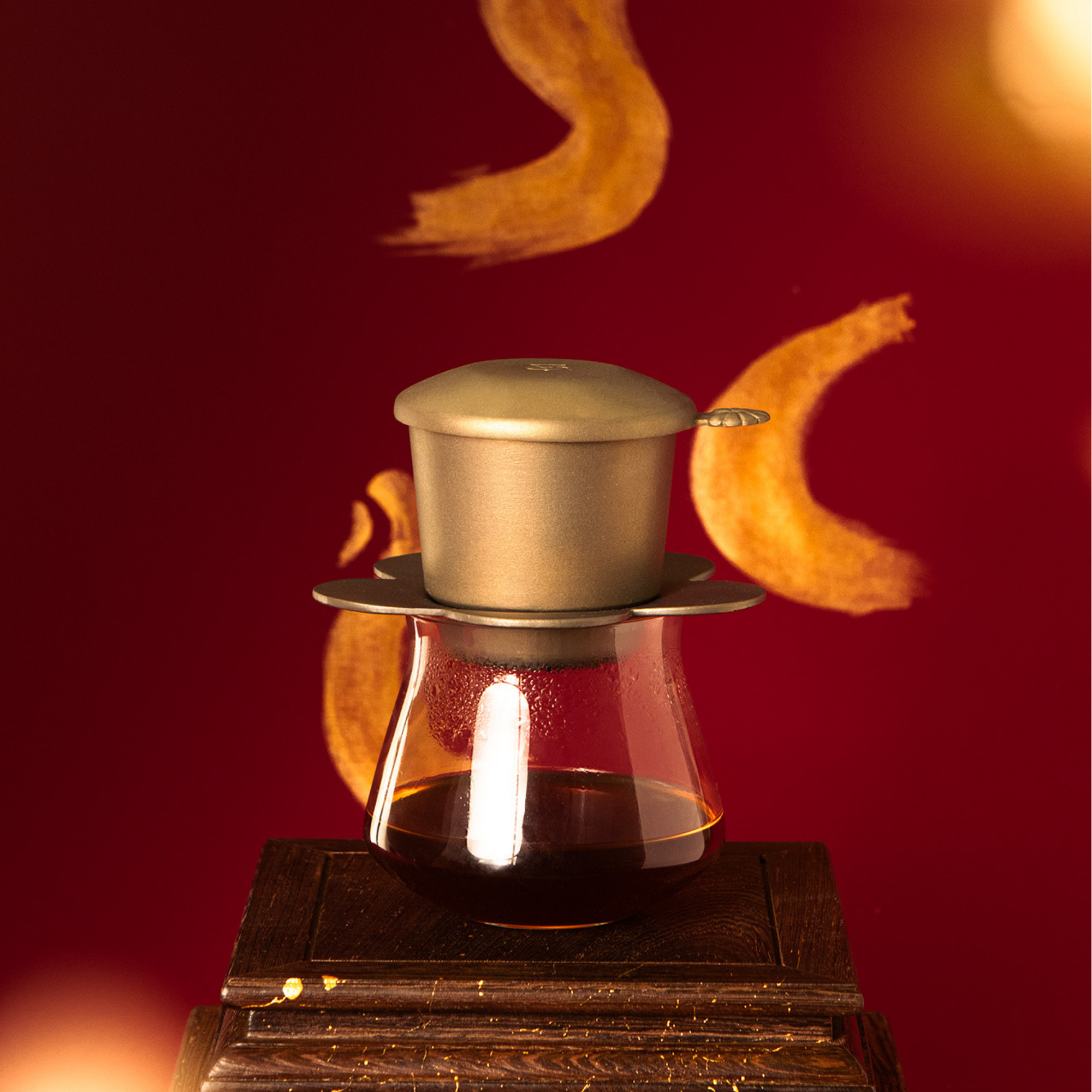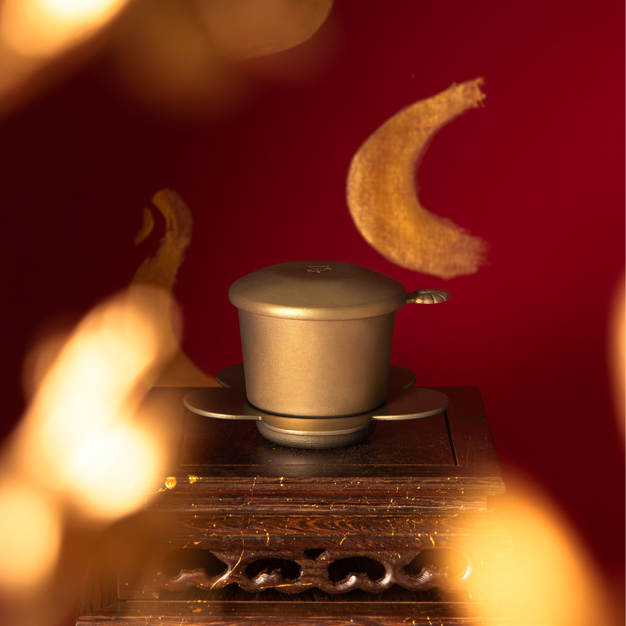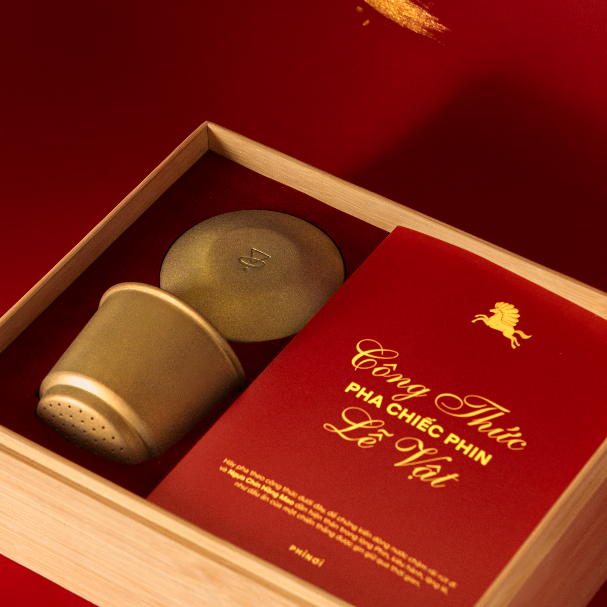Ngựa Chín Hồng Mao ẩn mình trong thân Phin, kín đáo và lặng lẽ như một lễ vật được cất giữ cẩn trọng. Mỗi lần pha cà phê là một nghi lễ, nơi câu chuyện Sơn Tinh Thuỷ Tinh được tái hiện trong đời sống hiện đại. Khi nước dâng lên rồi chậm rãi rút đi, hình tượng Ngựa Chín Hồng Mao dần lộ diện, kiêu hãnh như chiến thắng cuối cùng của Sơn Tinh sau những lần đối đầu khắc nghiệt.